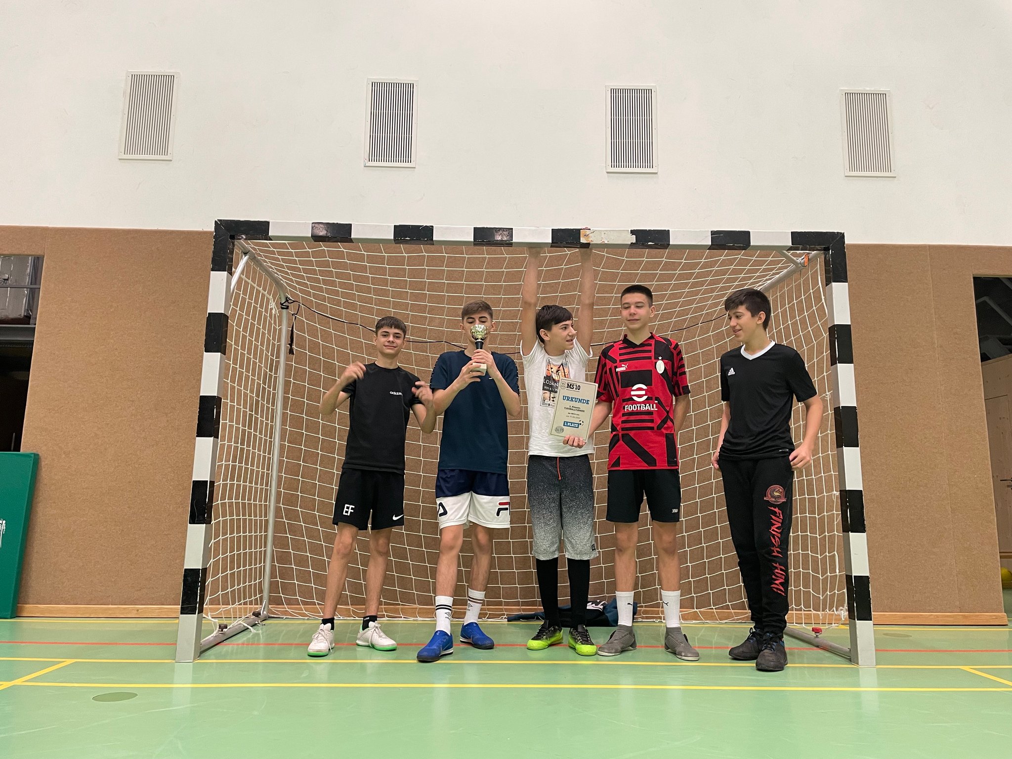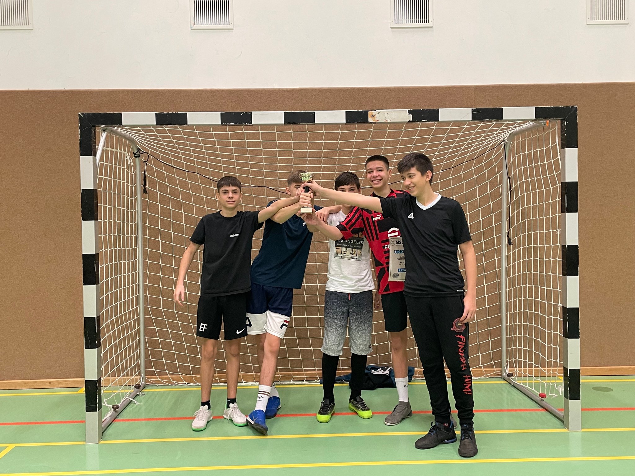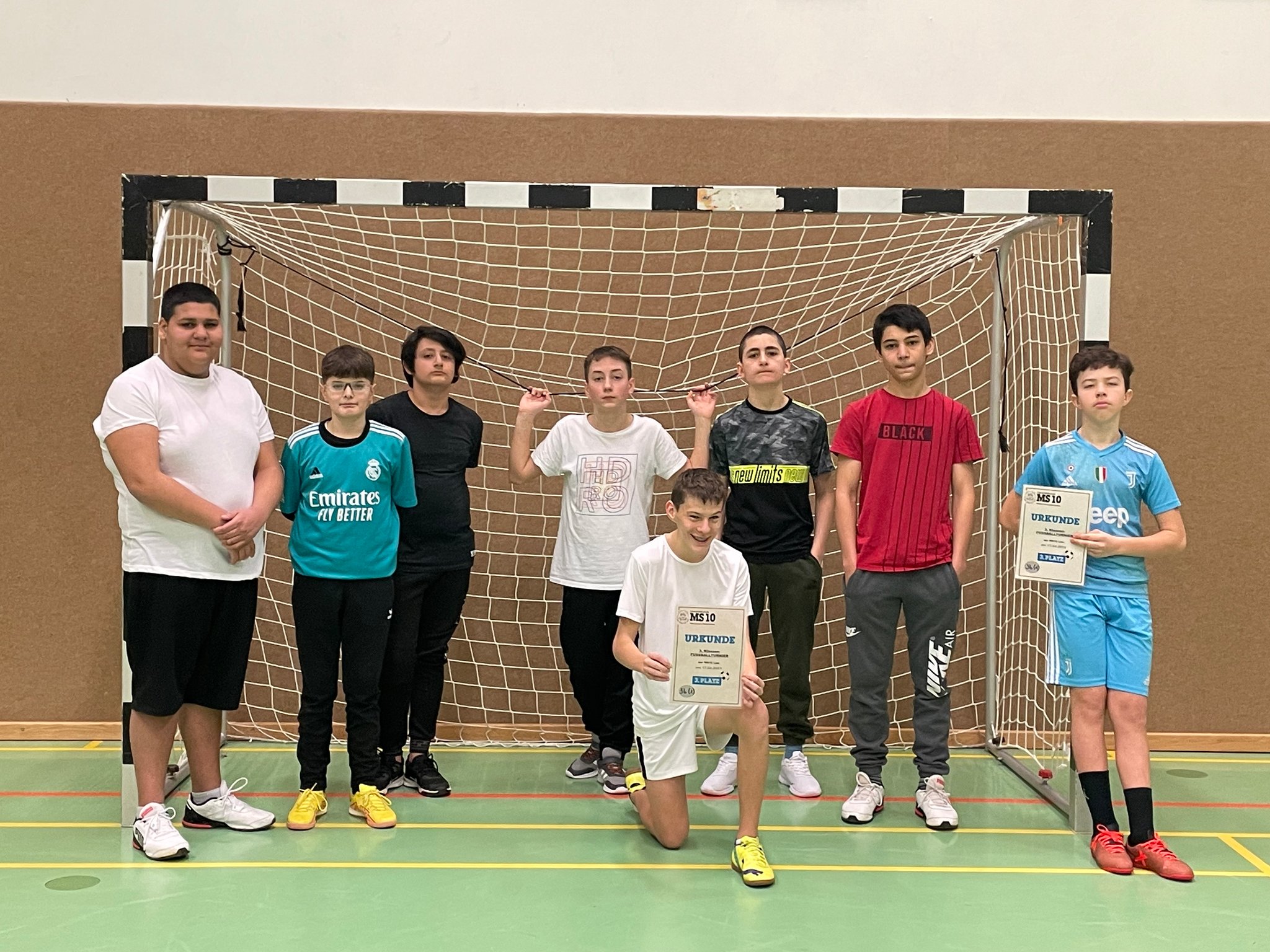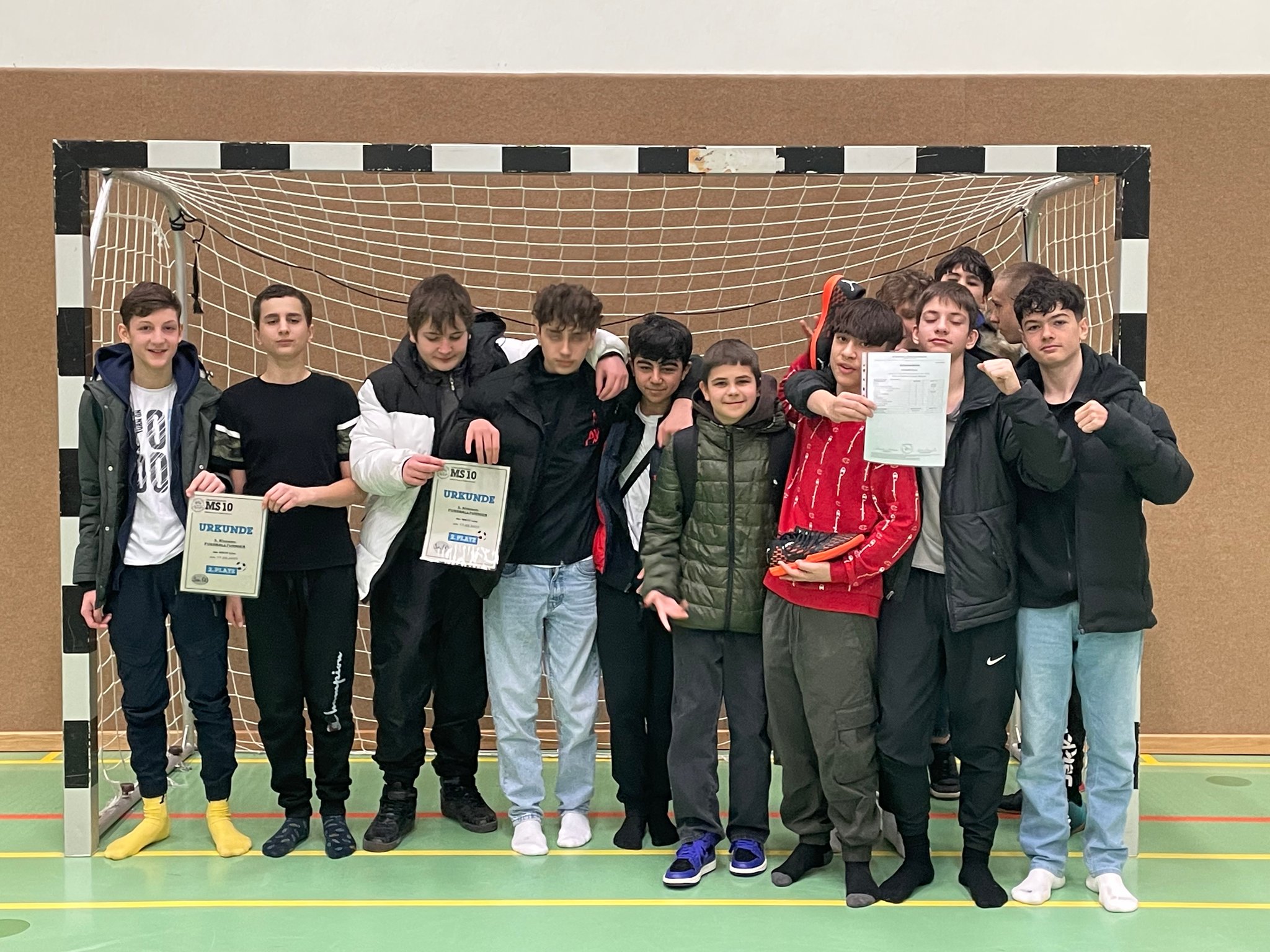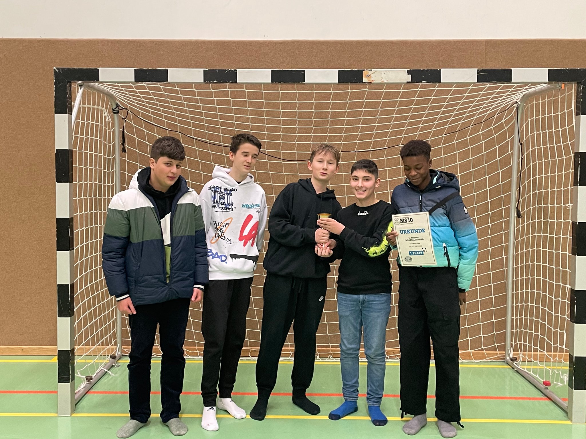 Am 20. April fand an der MS26 ein Hallenfußballturnier für Schüler der 4.Klassen an Linzer Mittelschulen statt. Die Vorfreude auf das Turnier war groß und so machte sich ein Team der 4c gemeinsam mit Herrn Froschauer auf den Weg, den Pokal für die MS10 zu holen. In zwei Gruppen duellierten sich insgesamt 10 Mannschaften um den heiß begehrten Turniersieg. Die Gruppenspiele waren alle hart umkämpft, schließlich wollte jede Mannschaft den ersten Platz erreichen, um ins Finale einzuziehen. Emotionen kochten hoch, Enttäuschung und Freude wechselten sich ab und viele Spiele waren spannend bis zum Schluss. So war auch für die MS10 bis zum letzten Gruppenspiel noch alles möglich. Nach zwei Siegen und einer Niederlage in der Gruppenphase musste im letzten Gruppenspiel ein Sieg her, damit der Einzug ins Finale gesichert werden konnte. Trotz zahlreicher Chancen erreichte man am Ende „nur“ den guten zweiten Platz in der Gruppe B und damit war der Einzug ins „kleine Finale“ geschafft. Im letzten Spiel um Platz 3 gegen die MS12 ging es wild hin und her, trotz großer Überlegenheit wollte aber kein Tor gelingen. In der letzten Minute dann die bittere Enttäuschung; ein Schuss des Gegners landete im Netz. Das Spiel war verloren.